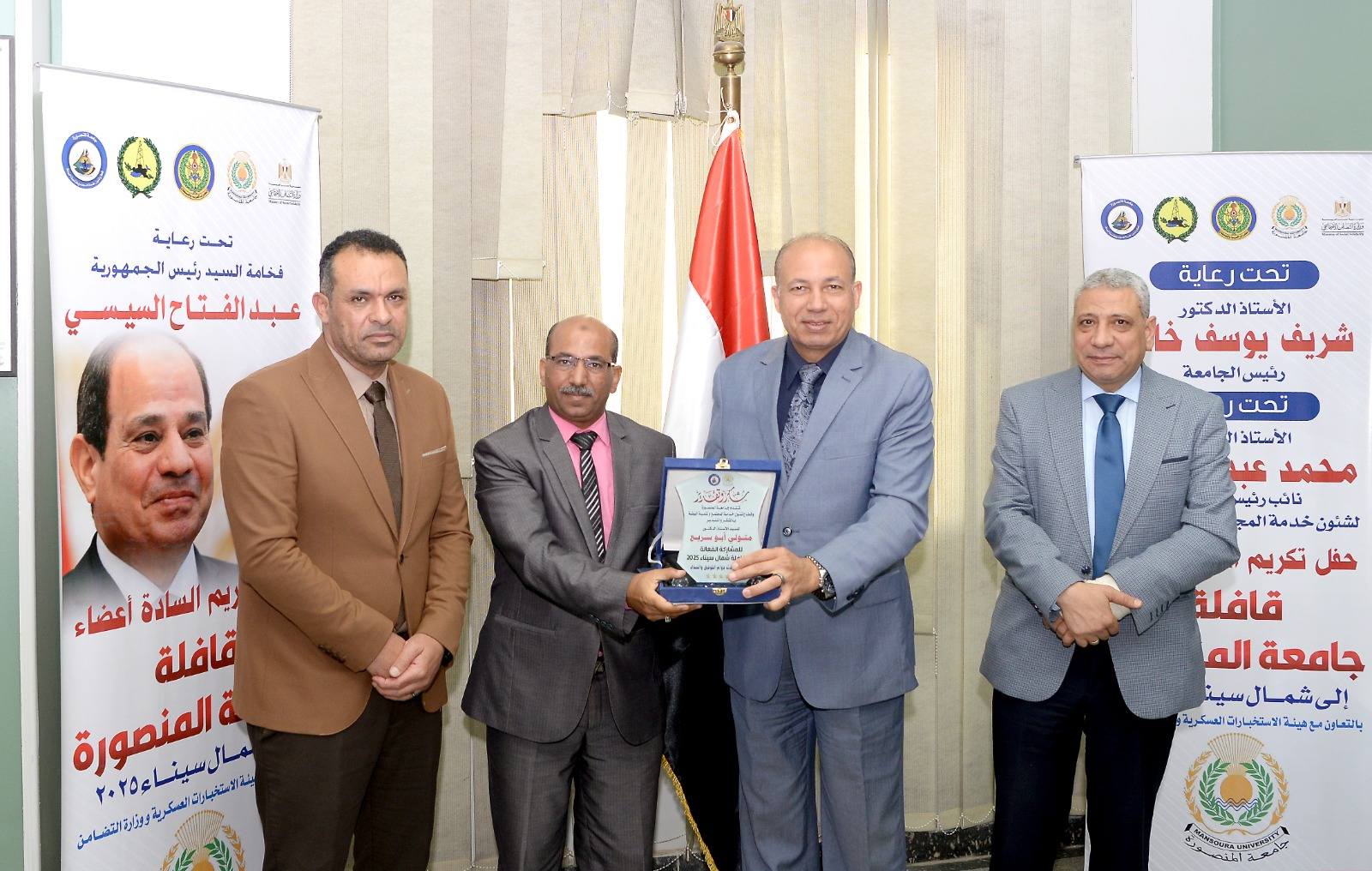 كرَّم الدكتور شريف يوسف خاطر، رئيس جامعة المنصورة، أعضاء القافلة التنموية الشاملة "جسور الخير ٢٢"، تقديرًا لجهودهم المخلصة وعطائهم المستمر في خدمة أهالي شمال سيناء، وكان من بين المكرمين الدكتور متولي أبو سريع، وكيل كلية الزراعة لشئون خدمة المجتمع وتنمية البيئة والمدير الإداري للقافلة، اعترافًا بمساهماته المتميزة وإدارته الفاعلة التي ساهمت في نجاح القافلة.