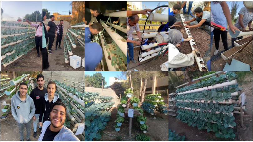 المشروع الأول حمل عنوان (تأثير مخاليط بيئات النمو وأغطيتها البلاستيكية على نمو ومحصول وجودة خس الرؤوس النامي بدون تربة في وحدات هرمية الشكل من مواسير الـ PVC البلاستيكية)، وركز على زراعة صنف "بيج بيل" من خس الرؤوس داخل وحدات زراعة رأسية مصممة لتناسب أسطح المباني، حيث درس الطلاب تأثير خلطات من بيئات النمو الصناعية مثل البيت موس والفيرميكيوليت والبيرليت، مع دراسة أثر تغطية هذه البيئات بشرائح بولي إثيلين شفافة أو سوداء، أو تركها بدون تغطية. استهدف المشروع تقليل استهلاك المياه والأسمدة، وتحقيق إنتاج مرتفع من محاصيل صحية ذات جودة عالية، مع الحفاظ على البيئة والابتعاد عن المشكلات المرتبطة بالتربة الزراعية التقليدية مثل التملح وانتشار الأمراض. شارك في تنفيذ المشروع الطلاب آية محمد أحمد الشبراوي، روان شريف الجرايحي محمد حامد، محمد وليد علي محمد السعدي، ومحمود السيد عبد الله العرابي، تحت إشراف الأستاذ الدكتور وليد علي محمد السعدي والأستاذ الدكتور السعيد السيد متولي فرج.