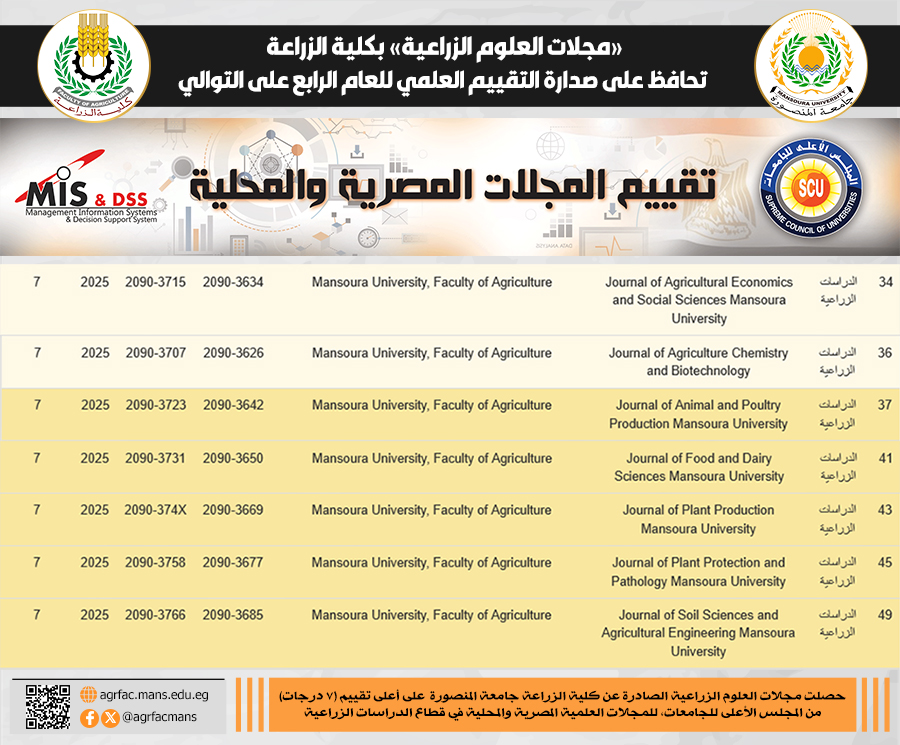 في إنجاز جديد يعكس التميز الأكاديمي والبحثي، حصلت مجلات العلوم الزراعية الصادرة عن كلية الزراعة جامعة المنصورة، على أعلى تقييم (7 درجات) من المجلس الأعلى للجامعات، وذلك ضمن التقييم السنوي للمجلات العلمية المصرية والمحلية في قطاع الدراسات الزراعية لعام 2025، ويُعد هذا الإنجاز تتويجًا للجهود المستمرة التي تبذلها الكلية في دعم النشر العلمي المتميز وتعزيز مكانة مجلاتها كمنصات علمية رصينة، حيث تُصدر الكلية سبع مجلات متخصصة تُعنى بنشر الأبحاث والدراسات الزراعية وفق معايير علمية دقيقة.