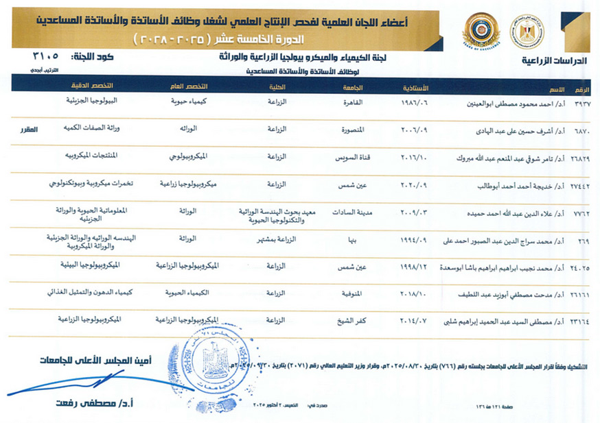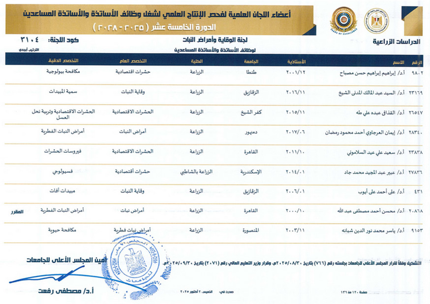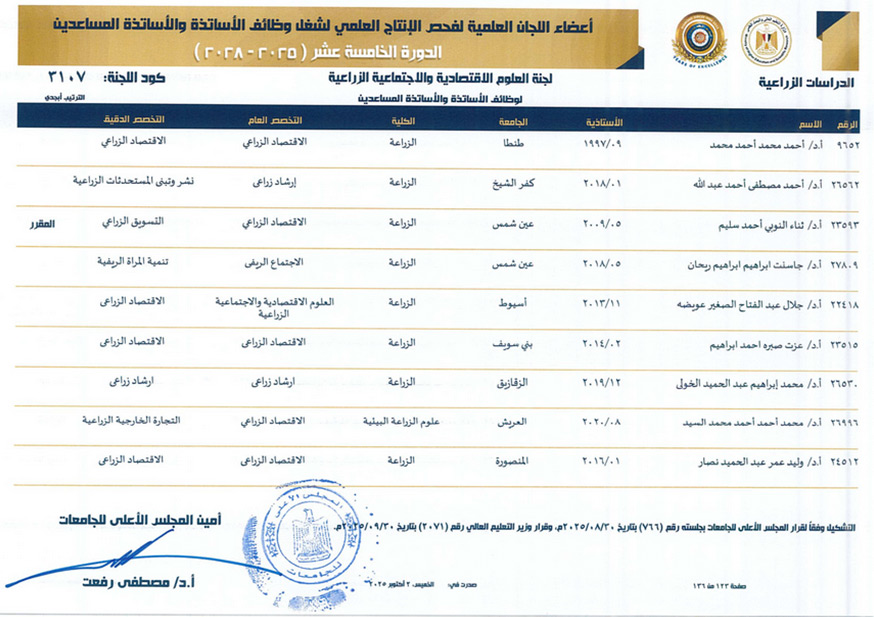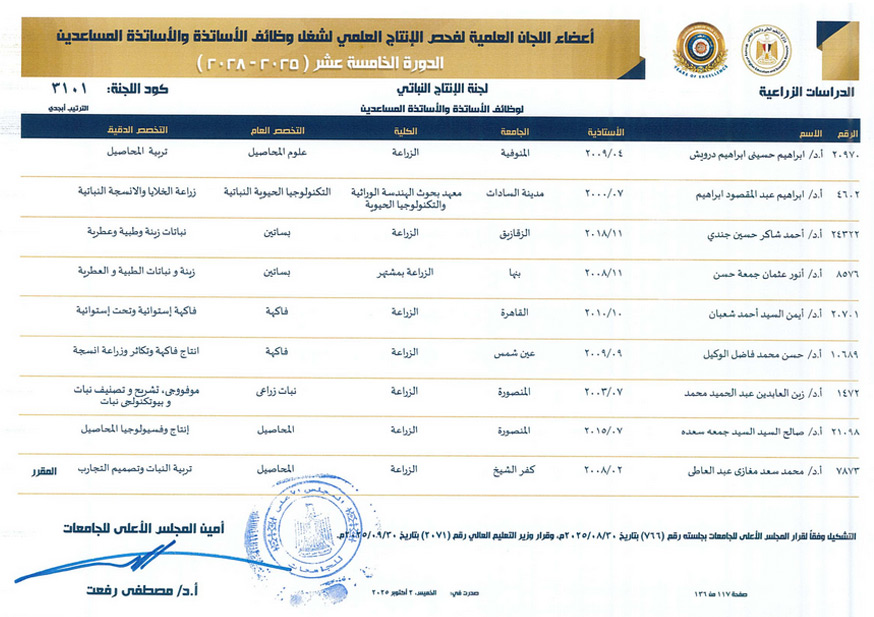 6 أساتذة من كلية الزراعة جامعة المنصورة في التشكيل الجديد للجان العلمية الدائمة للترقيات بالمجلس الأعلى للجامعات