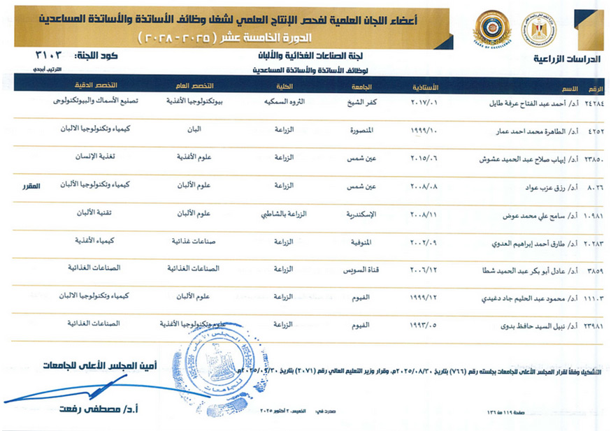 - أ.د. أشرف حسين علي عبد الهادي – لجنة الكيمياء والميكروبيولوجيا الزراعية والوراثة.