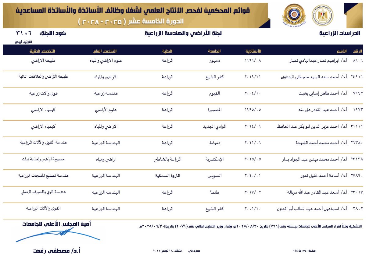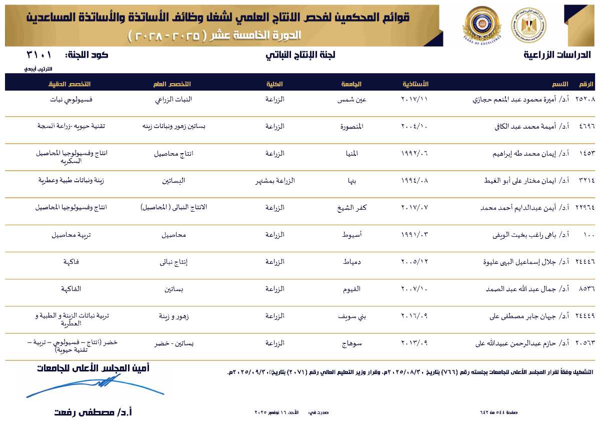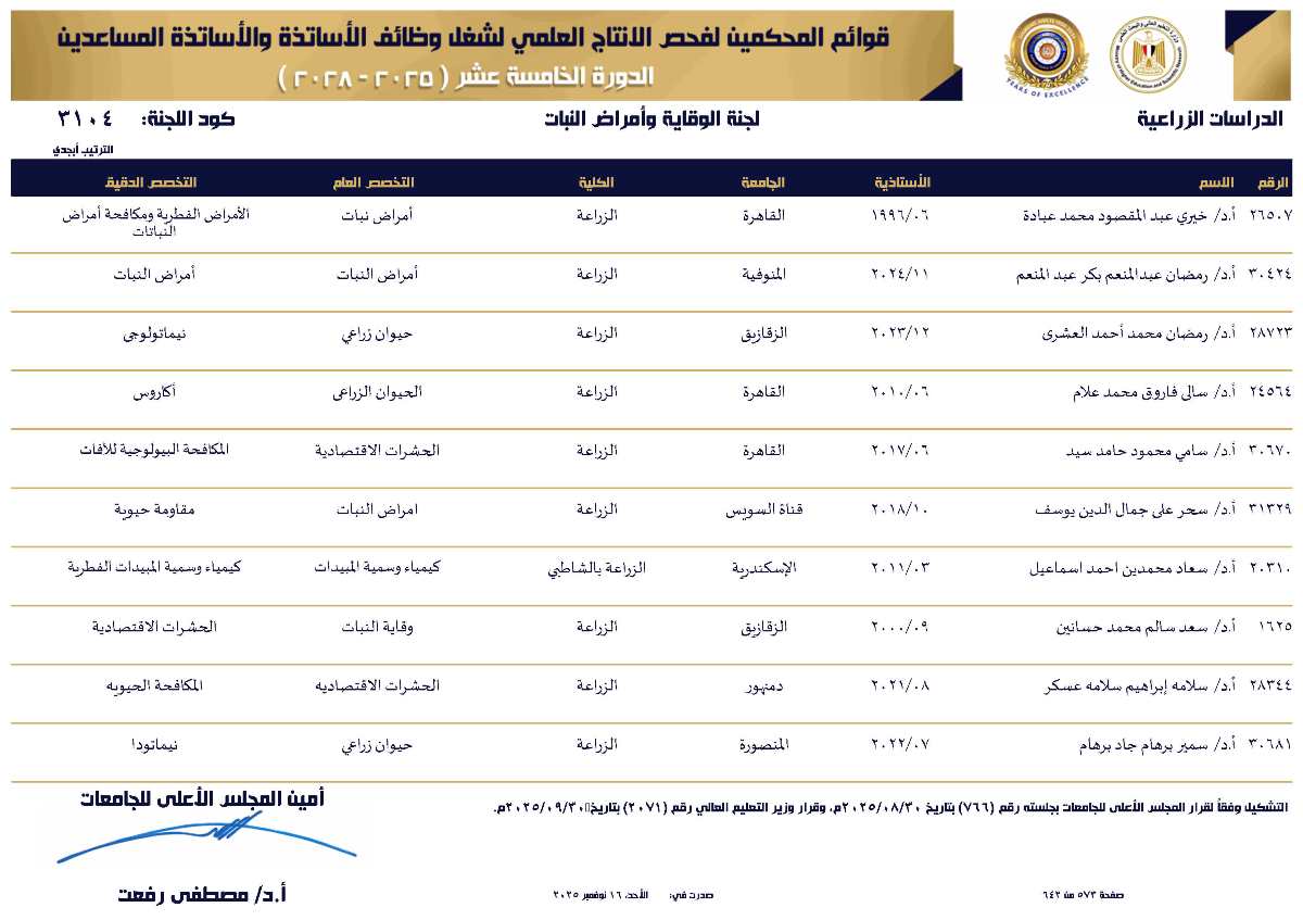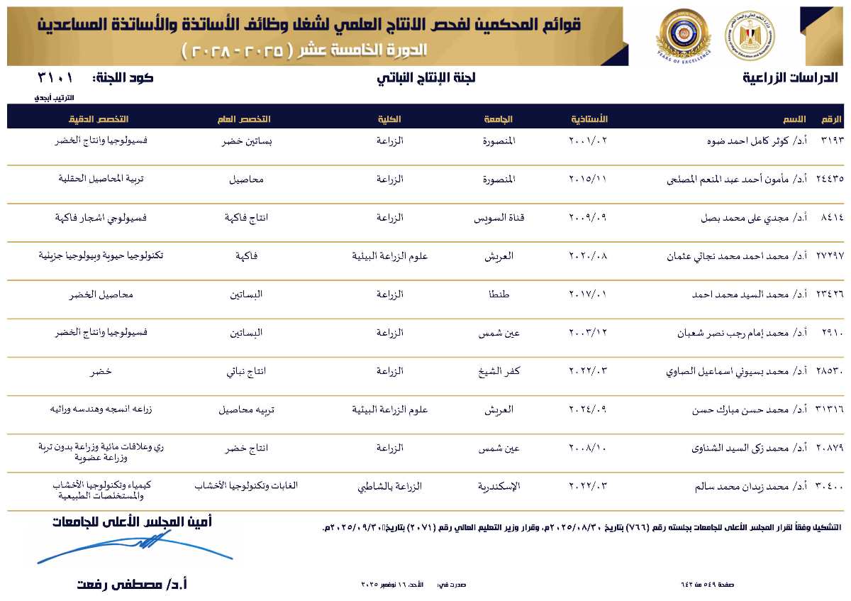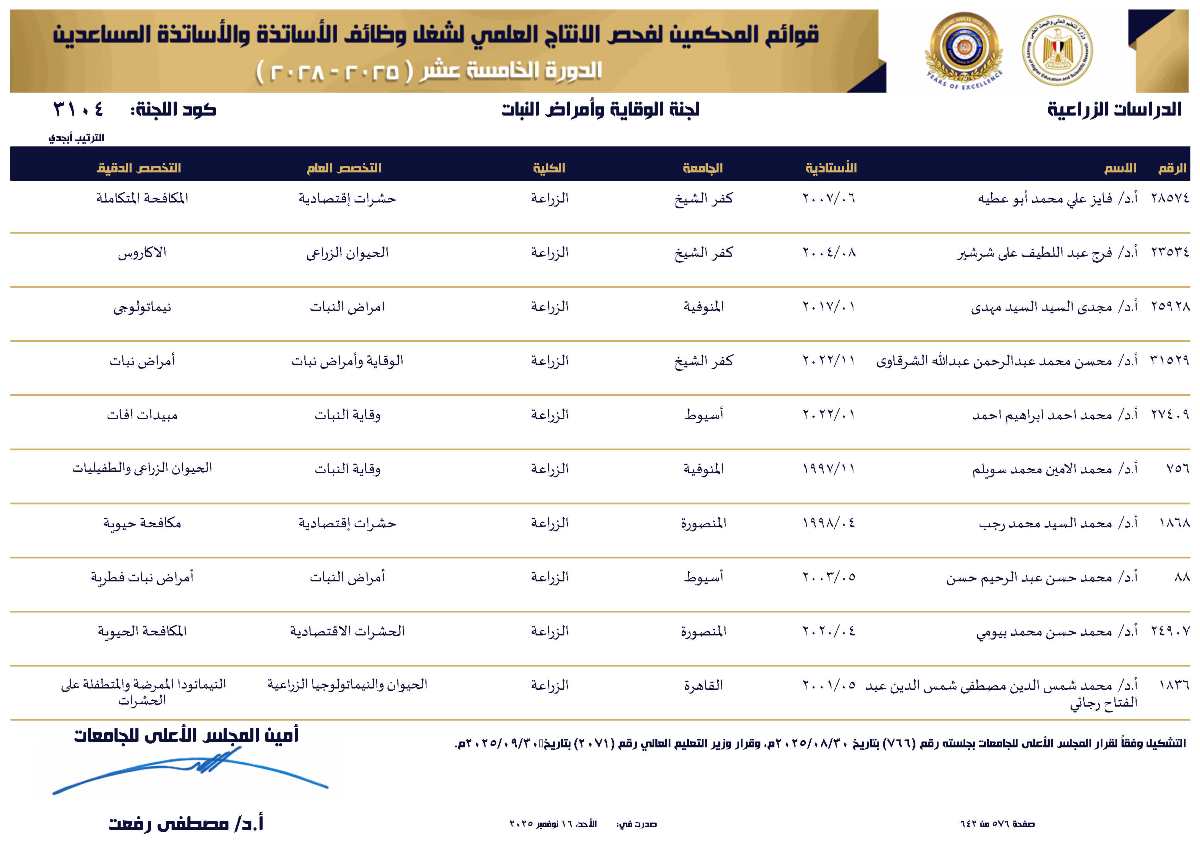 أعلن المجلس الأعلى للجامعات يوم الأحد 16 نوفمبر 2025 عن قوائم المُحكّمين للدورة الخامسة عشرة (2025–2028) لفحص الإنتاج العلمي لشغل وظائف الأساتذة والأساتذة المساعدين. وقد شهدت القوائم حضورًا بارزًا لكلية الزراعة بجامعة المنصورة، بعد اختيار 40 عضوًا من أعضاء هيئة التدريس بالكلية للعمل ضمن لجان الدراسات الزراعية السبع، ويعكس هذا الاختيار المكانة العلمية والبحثية المتميزة لكلية الزراعة بجامعة المنصورة، كما يؤكد الثقة الأكاديمية فى كفاءة أساتذتها ودورهم المحوري فى ضمان جودة عمليات التقييم العلمي على مستوى الجامعات المصرية.