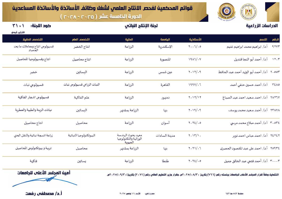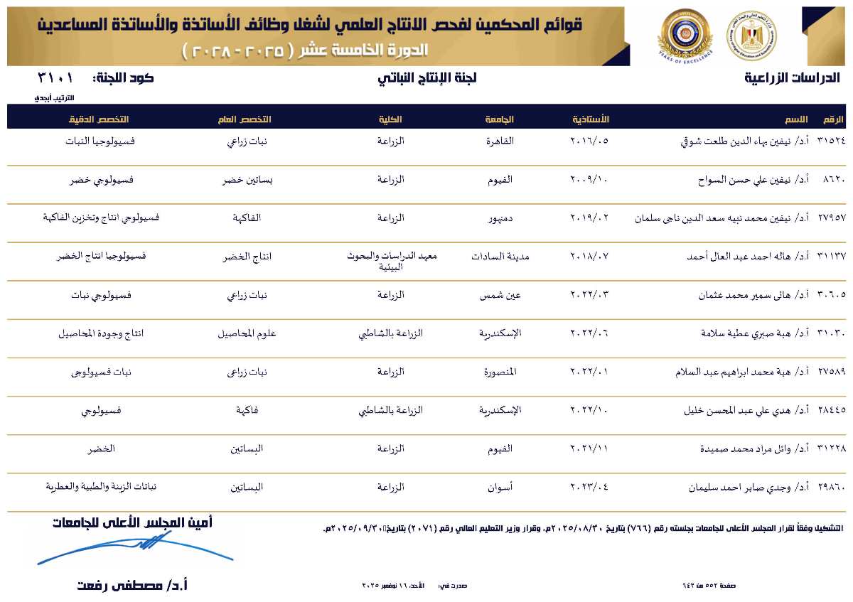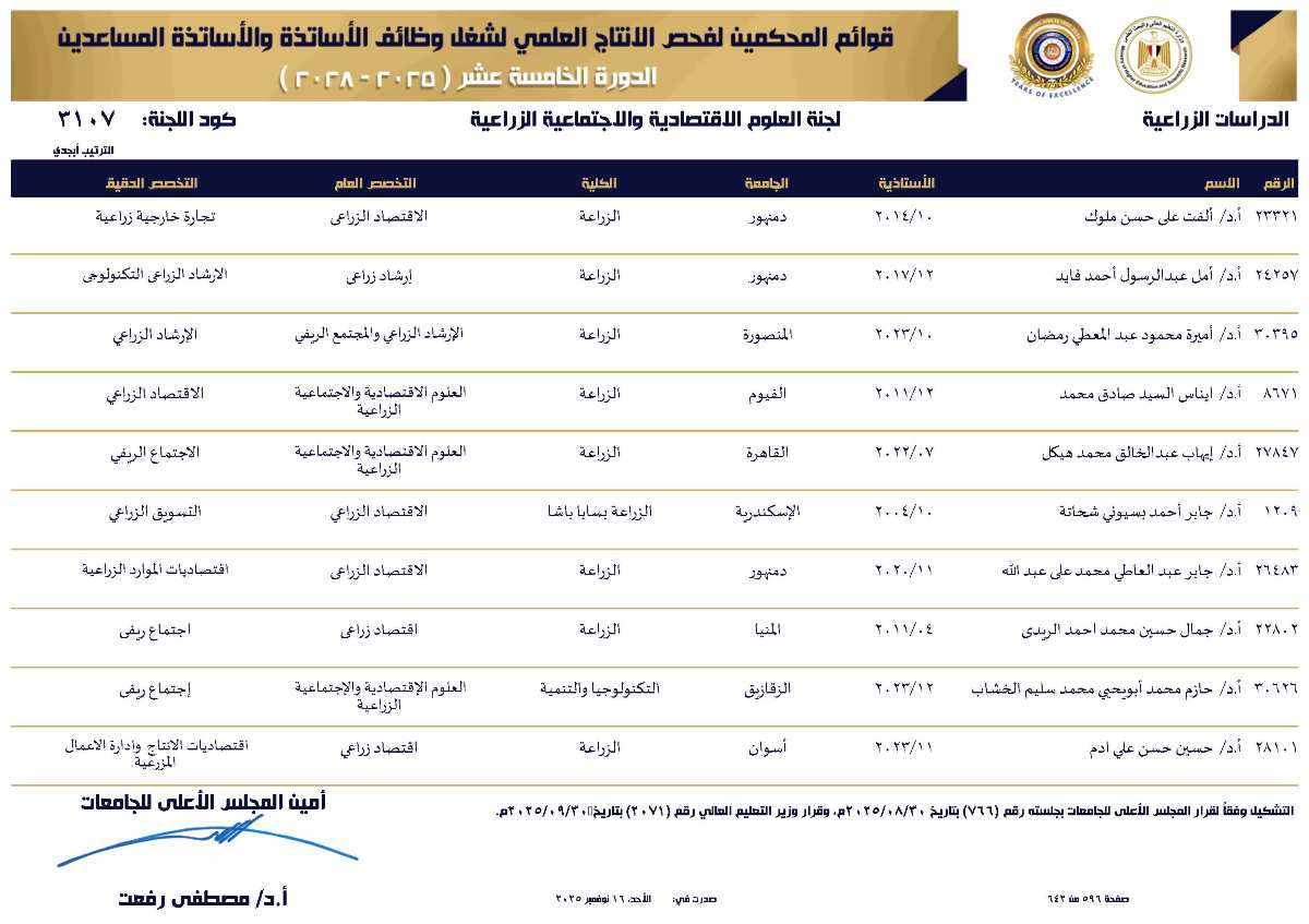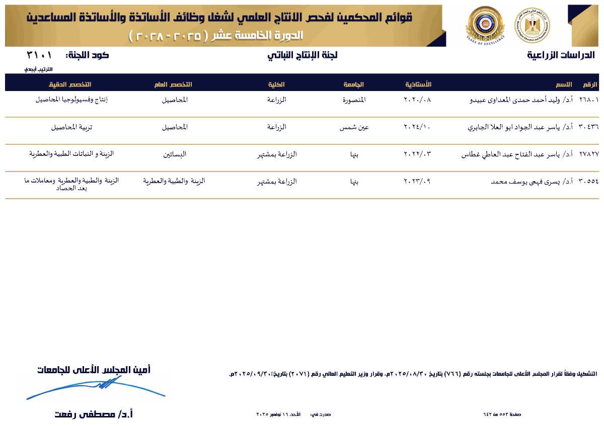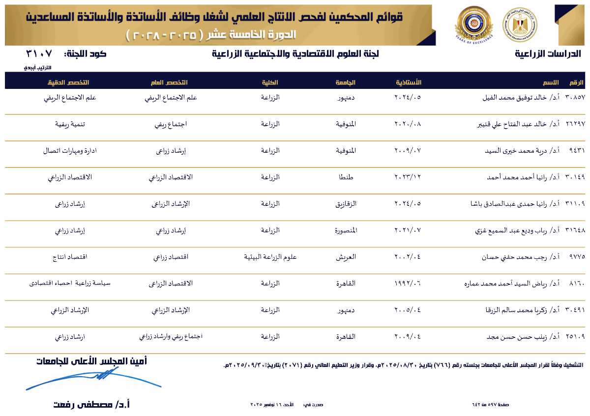 أعلن المجلس الأعلى للجامعات يوم الأحد 16 نوفمبر 2025 عن قوائم المُحكّمين للدورة الخامسة عشرة (2025–2028) لفحص الإنتاج العلمي لشغل وظائف الأساتذة والأساتذة المساعدين. وقد شهدت القوائم حضورًا بارزًا لكلية الزراعة بجامعة المنصورة، بعد اختيار 40 عضوًا من أعضاء هيئة التدريس بالكلية للعمل ضمن لجان الدراسات الزراعية السبع، ويعكس هذا الاختيار المكانة العلمية والبحثية المتميزة لكلية الزراعة بجامعة المنصورة، كما يؤكد الثقة الأكاديمية فى كفاءة أساتذتها ودورهم المحوري فى ضمان جودة عمليات التقييم العلمي على مستوى الجامعات المصرية.
