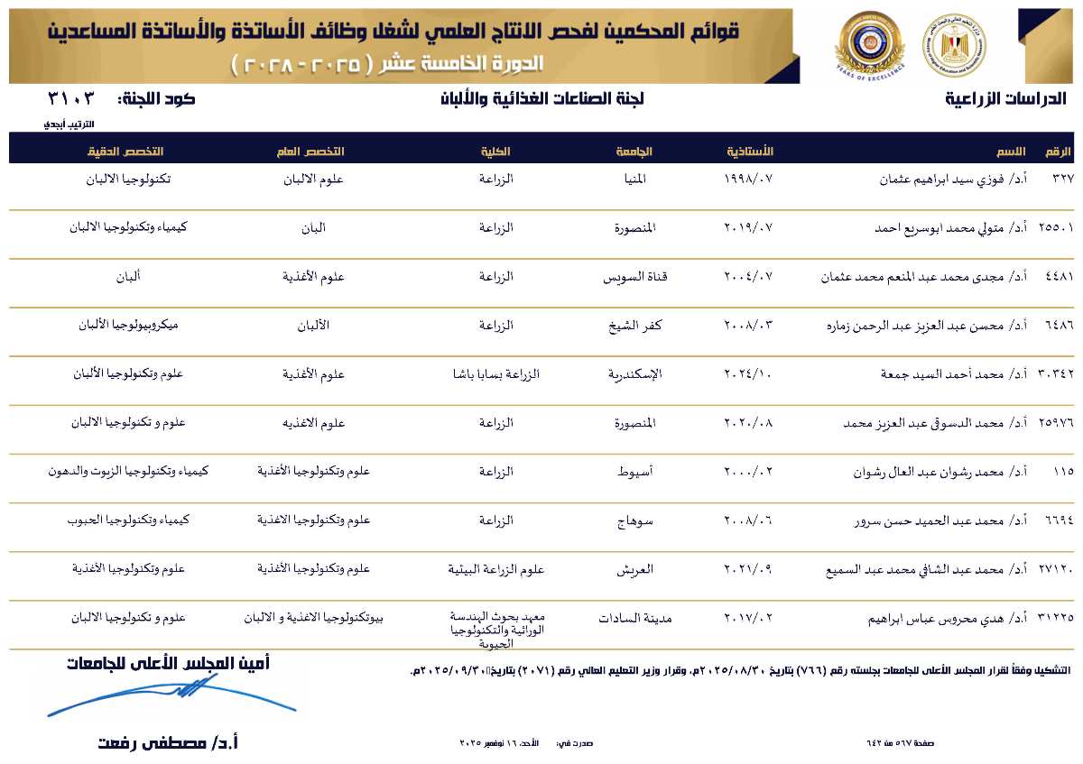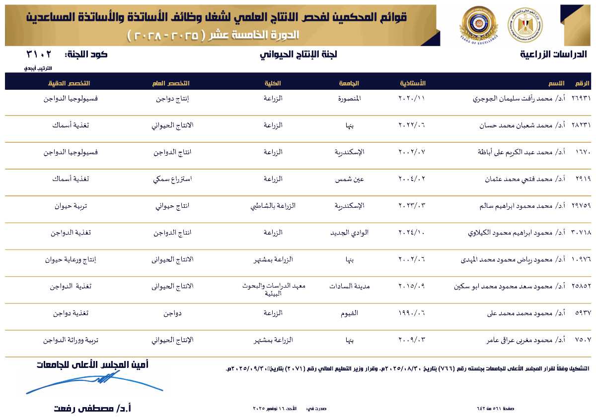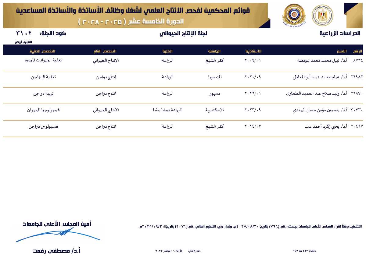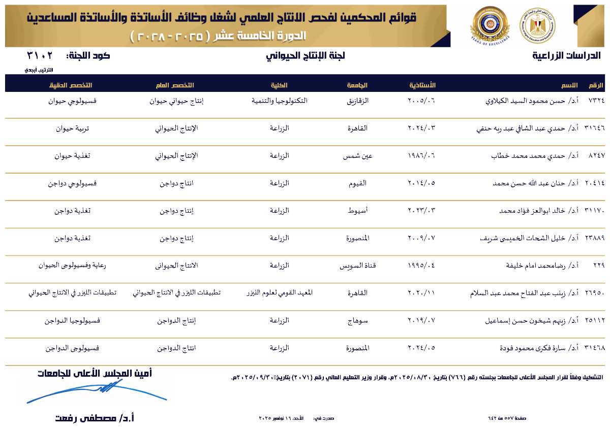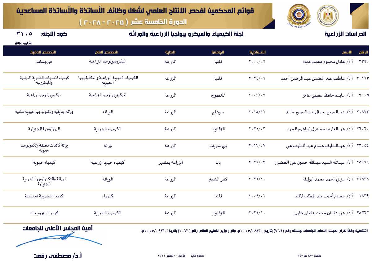 أعلن المجلس الأعلى للجامعات يوم الأحد 16 نوفمبر 2025 عن قوائم المُحكّمين للدورة الخامسة عشرة (2025–2028) لفحص الإنتاج العلمي لشغل وظائف الأساتذة والأساتذة المساعدين. وقد شهدت القوائم حضورًا بارزًا لكلية الزراعة بجامعة المنصورة، بعد اختيار 40 عضوًا من أعضاء هيئة التدريس بالكلية للعمل ضمن لجان الدراسات الزراعية السبع، ويعكس هذا الاختيار المكانة العلمية والبحثية المتميزة لكلية الزراعة بجامعة المنصورة، كما يؤكد الثقة الأكاديمية فى كفاءة أساتذتها ودورهم المحوري فى ضمان جودة عمليات التقييم العلمي على مستوى الجامعات المصرية.