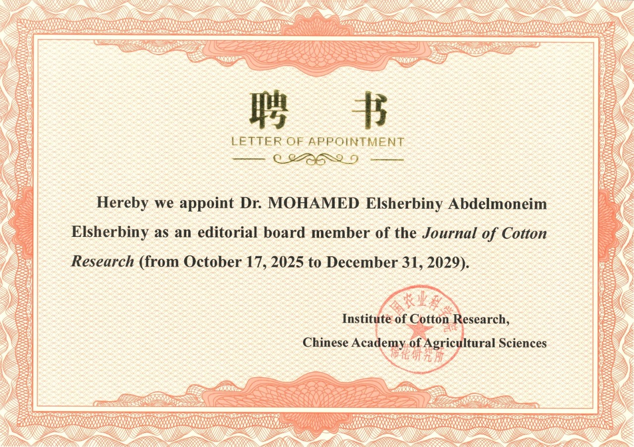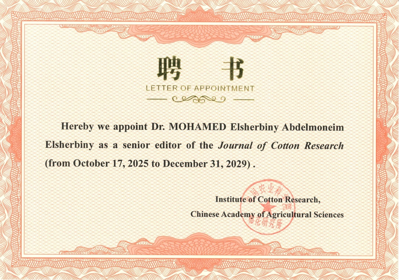 اختيار أ.د/ الشربيني عبد المنعم الشربيني كبير محررين بمجلة Journal of Cotton Research الصادرة عن دار Springer العالمية
