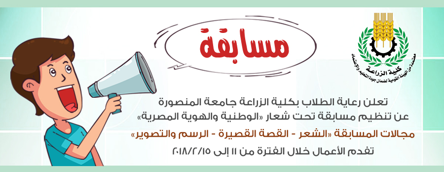 تعلن رعاية الطلاب بكلية الزراعة عن تنظيم مسابقة على مستوى الكلية تحت شعار "الوطنية والهوية المصرية" في مجالات "الشعر - القصة القصيرة - الرسم والتصوير".