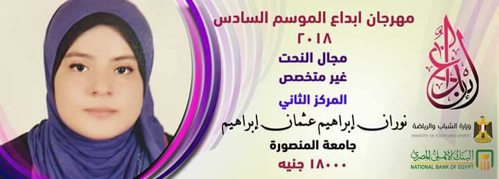 حصلت الطالبة/ نوران ابراهيم عثمان على المركز الثانى بمسابقة (مجال النحت) ضمن مهرجان ابداع الموسم السادس 2018، والتى نفذتها وزارة الشباب والرياضة بالتعاون مع البنك الأهلى المصرى.