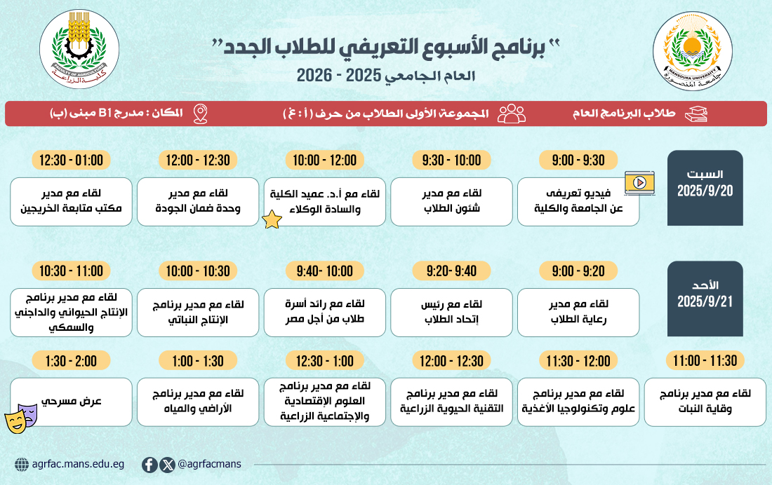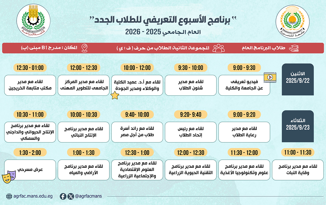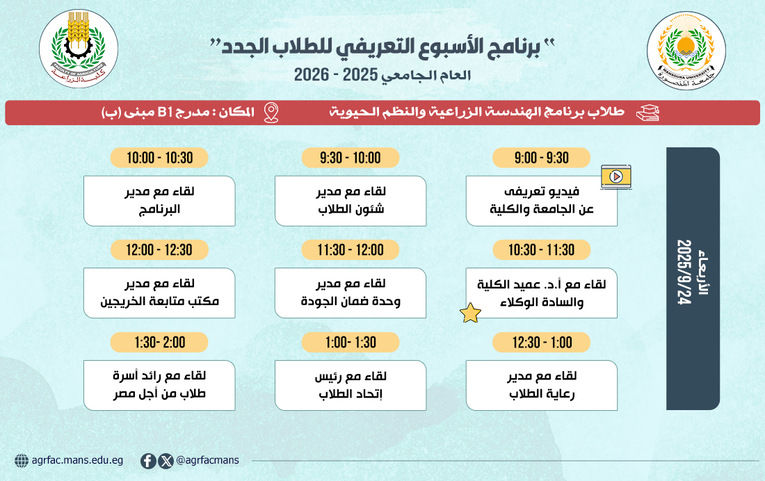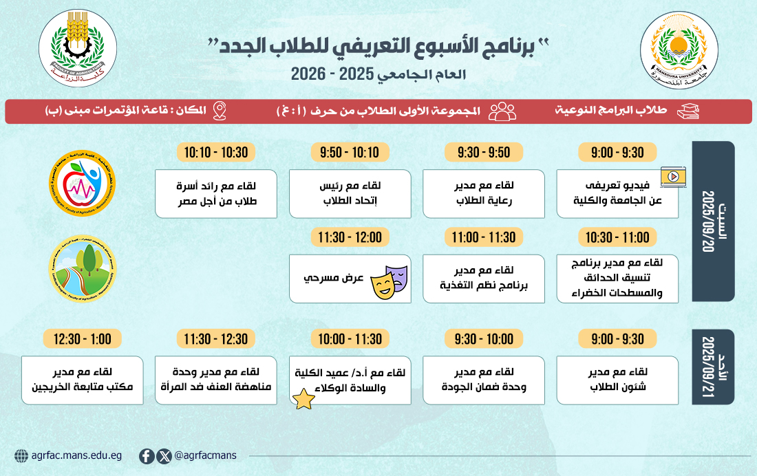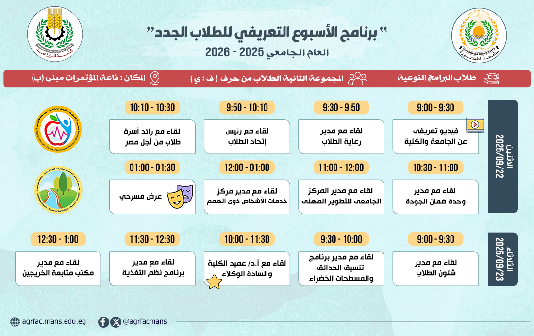 برنامج فعاليات الأسبوع التعريفي لطلاب كلية الزراعة الجدد (العام الجامعي 2025/2026)